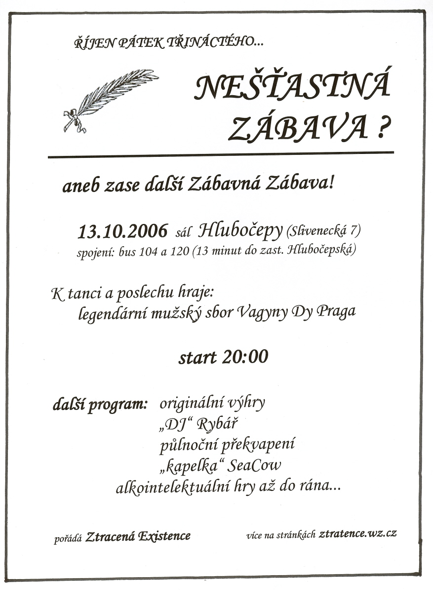I přes stylovou nepřízeň osudu se v říjnu pátek třináctého roku 2006 uskutečnil již čtvrtý ročník Zábavy a to zase v sále Hlubočepy. Program i kostýmy byly laděny tématicky do tragična...
